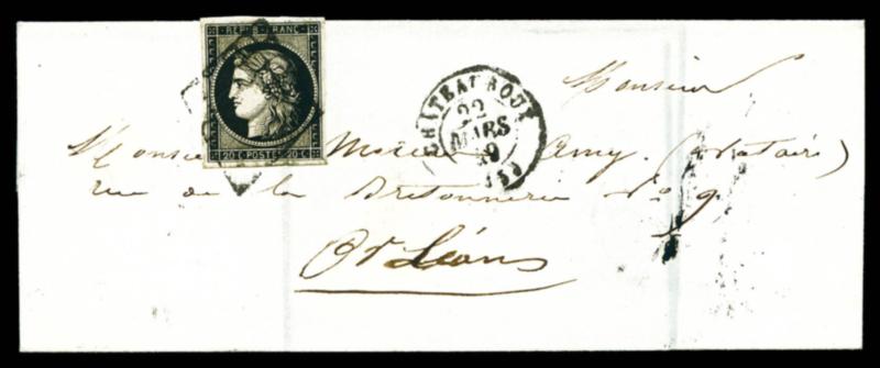 N°1c, 10c bistre-verdâtre foncé obl pc 1711 + cursive 80/L'Hommaizé sur enveloppe pour Lussac. SUP (certificat) Qualité: Oblitéré Cote: 1850 euros