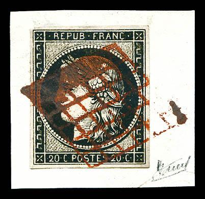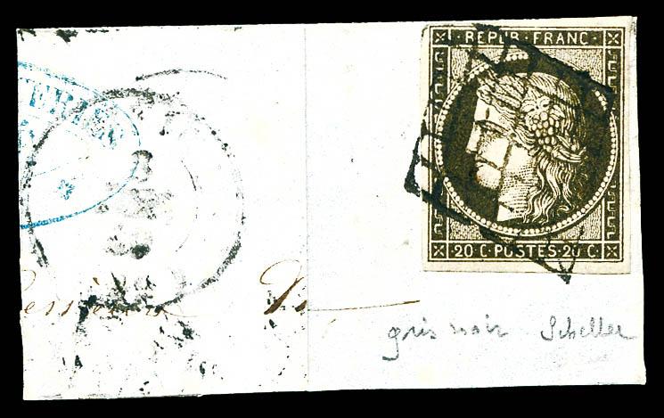 N°3c, 20c gris-noir obl grille sur son support. TB (signé Scheller) Qualité: Oblitéré Cote: 550 euros