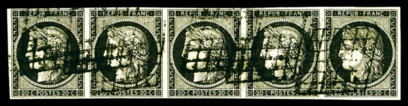 N°3, 20c noir sur jaune, bande de cinq, bien margée, obl. grille, TB. Signé Calves Qualité: Oblitéré Cote: 1700 euros