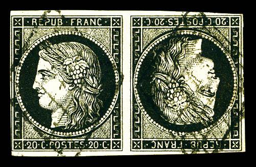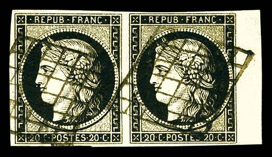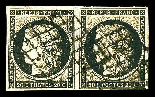 N°3d, 20c noir sur jaune en paire tête-bêche obl grille. TB. R. (signé Brun/certificat) Qualité: Oblitéré Cote: 9000 euros