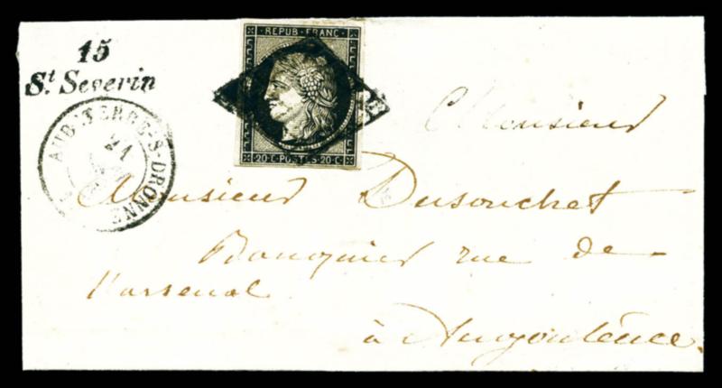 N°3, 20c noir, obl grille + cursive 15/St SEVERIN et càd type 15 de AUBETERRE S DRONNE sur lettre du 21 sept 1849 pour Angoulème. TTB (certificat) Qualité: Oblitéré