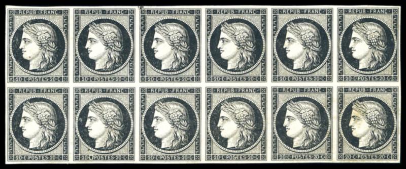 N°3a, 20c noir sur blanc en bloc de douze, des exemplaires *, très fraîs. SUPERBE. R.R. (signé Calves/certificat) Qualité: **