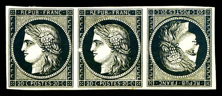 N°3e, 20c noir sur blanc: tête-bêche tenant à normaux en bande de trois avec variété recto-verso. SUPERBE. R.R. (signé Brun/certificat) Qualité: * Cote: 14700 euros
