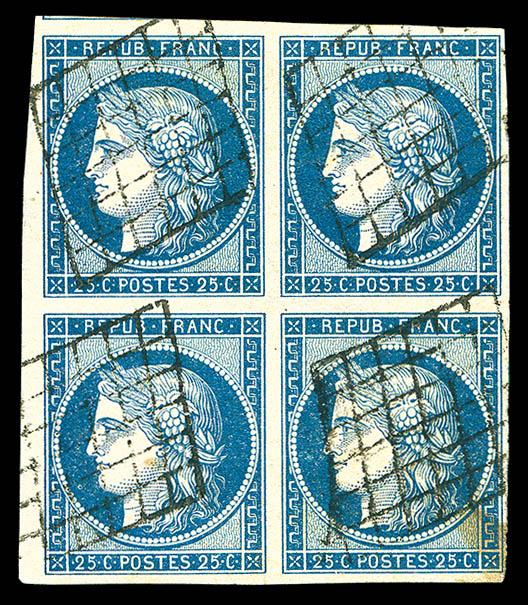 N°4, 25c bleu en bloc de quatre obl grille (pd), très belle présentation. R. (certificat) Qualité: Oblitéré Cote: 6250 euros