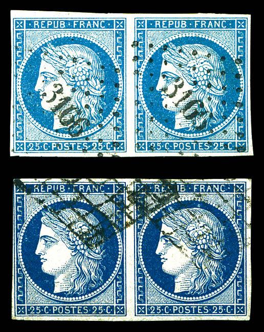 N°4, 25c bleu, 2 paires: en bleu et bleu foncé. TB Qualité: Oblitéré Cote: 325 euros