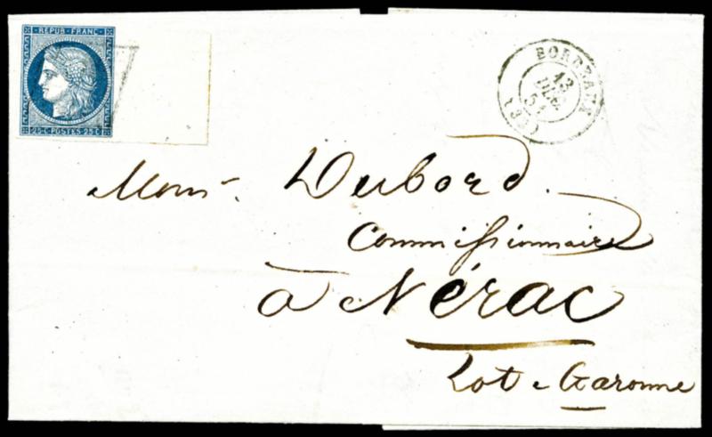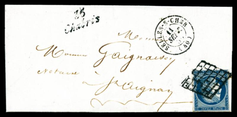 N°4, 25c bleu obl grille et càd de SELLES SUR CHER du 11 sept 50 + cursive 35/CHABRIS sur lettre pour St Aignan. TB (certificat) Qualité: Oblitéré
