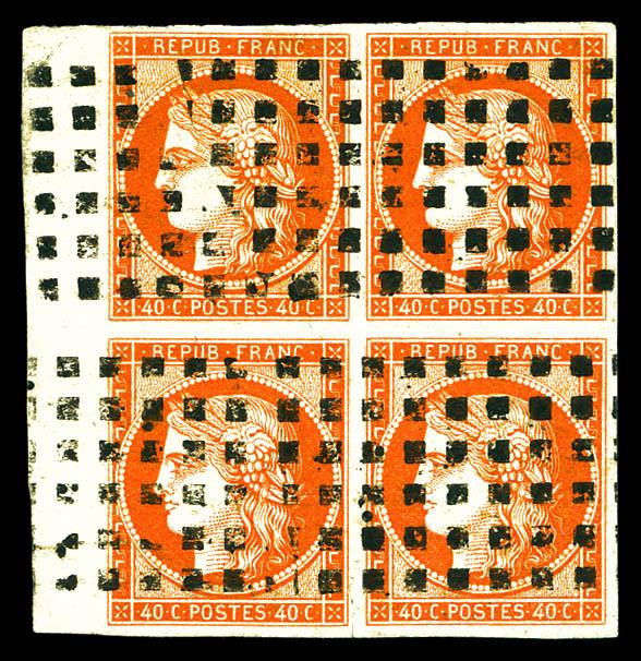 N°5, 40c orange, bloc de quatre bord de feuille latéral gauche oblitération gros points, pièce d'une qualité exceptionelle. SUPERBE. R.R. (signé Calves/Brun/Certificat) Qualité: Oblitéré Cote: 23000 euros