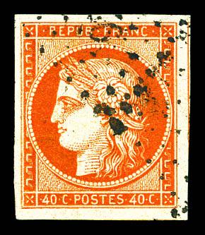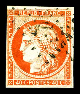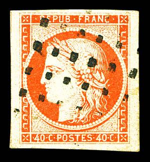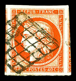 N°5, 40c orange obl grille sans fin, belles marges avec filet du voisin. Pièce choisie. SUP (signé Scheller/certificat) Qualité: Oblitéré Cote: 575 euros