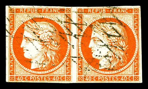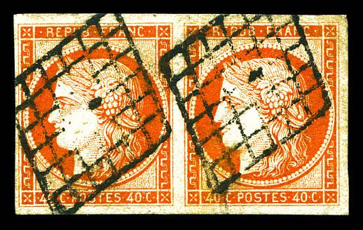 N°5, 40c orange en paire obl grille. TB (signé Calves/certificat) Qualité: Oblitéré Cote: 1200 euros