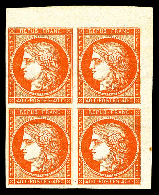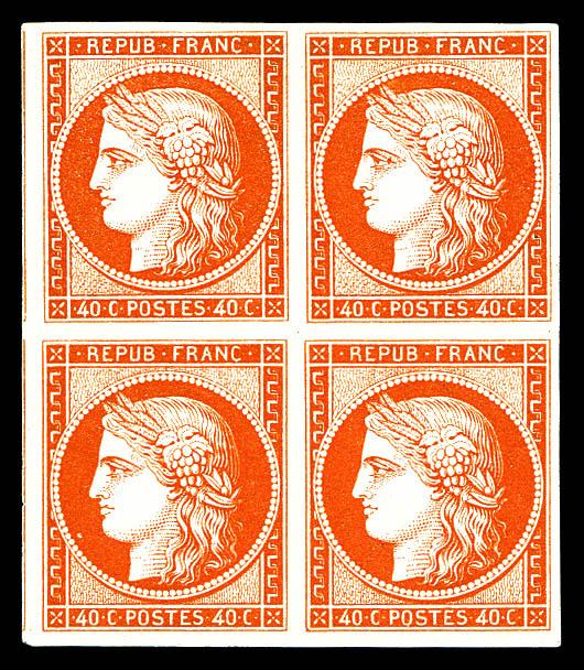 N°5m, Tirage de Londres: 40c orange en bloc de quatre, toujours sans gomme. SUPERBE. R.R.R. (signé Brun/Certificats) Qualité: (*) Cote: 12000 euros