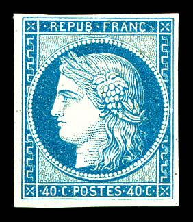 N°5B, 40c bleu, premier non émis, imprimé avant le 9 mars 1849, date de la décision du changement de couleur du 20c et du 40c, qui n'a été émis en orange qu'en février 1850. GRANDE RARETE, SUPERBE (signé Brun/certificats) Qualité: (*)