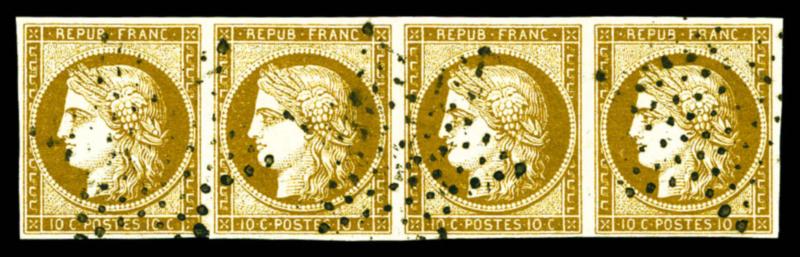N°1, 10c bistre-brun, bloc de quatre oblitération gros points, très jolie pièce. SUPERBE. R.R. (signé Scheller/Robineau/certificat) Qualité: Oblitéré Cote: 16000 euros