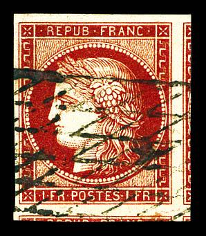 N°6b, 1F carmin foncé, obl grille, quatre belles marges avec voisin. SUP. R. (signé Scheller/Calves/certificat) Qualité: Oblitéré Cote: 1250 euros