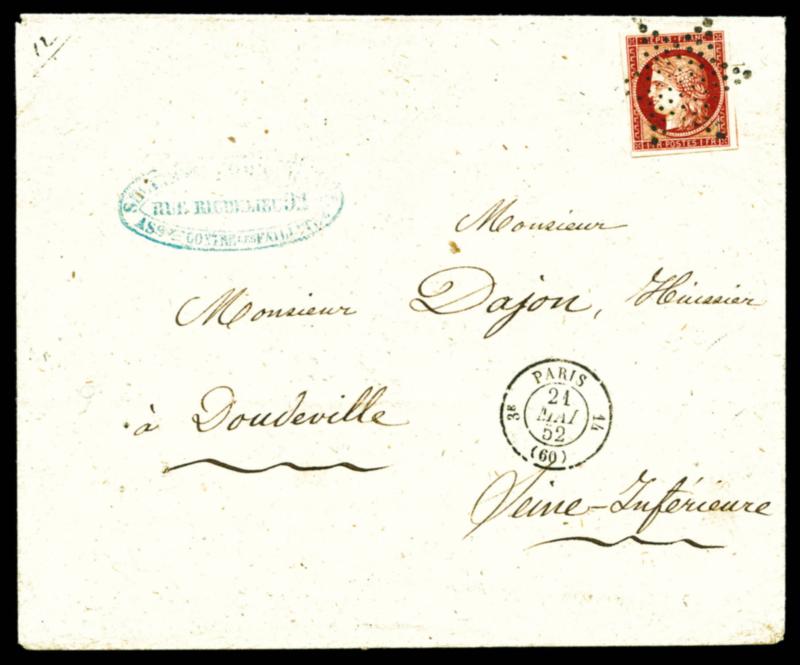 N°6, 1F carmin obl étoile muette sur lettre au départ de PARIS le 21 mai 52 pour Doudeville. SUP (certificat) Qualité: Oblitéré Cote: 1700 euros