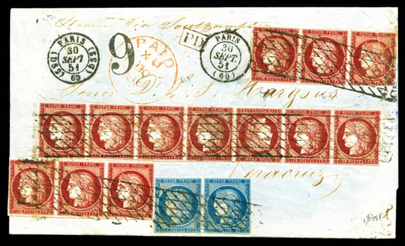 N°6/4, Paire du 25c bleu et 1F carmin en bande de 7 avec Tête-bêche au centre et deux bandes de 3 oblitérées grille sans fin avec CàD de PARIS du 30 septembre 1851 sur lettre 9ème échelon de poids (affranchissement à 13f 50) à destination du MEXIQUE par voie anglaise. Taxe à 9 reales à l'arrivée. Qu