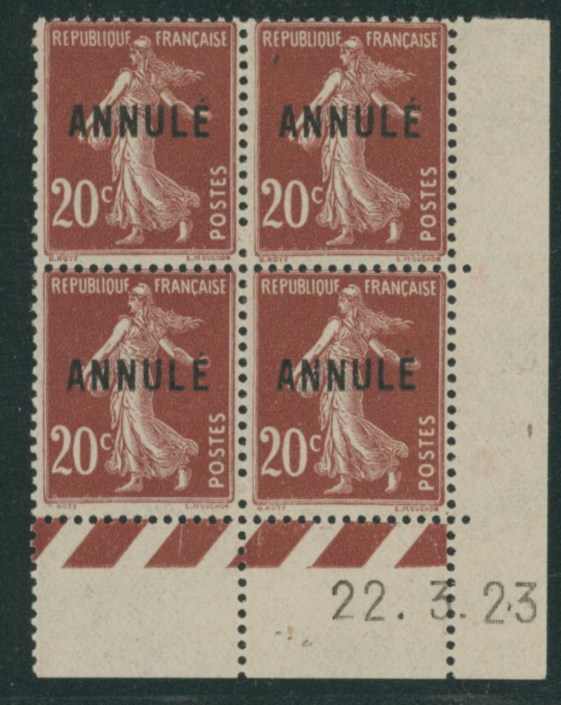 France 1923 Sower 20c block of four with ANNULE ovpt. unused