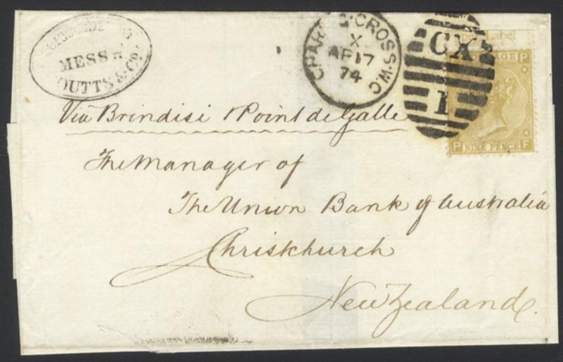NEW ZEALAND 1874 cover from London to Christchurch, franked 9d pale straw Pl.4 showing part marginal inscription at top (SG.111) tied by Charing Cross duplex for AP.17.74, obverse bears company oval h/stamp of 'COUTTS & Co' reverse Christchurch receiver for JU.9.74. (1)