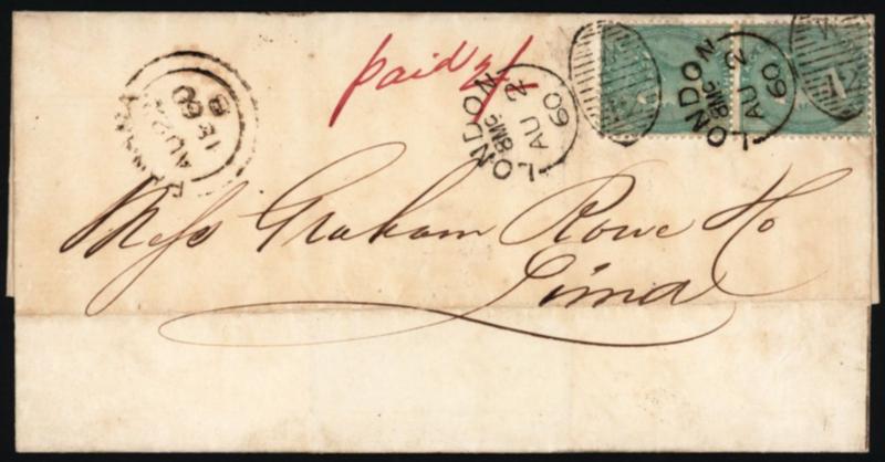 PERU 1860 cover from London to Lima, franked 1s pale green (SG.73) vertical pair tied by two very fine London sideways duplexes for AU.2.60, endorsed in red m/s 'paid 2/-' and at left side PANAMA AU.22.1860 transit double ring d/stamp, horizontal filing fold well clear of adhesives, hardly detracts.