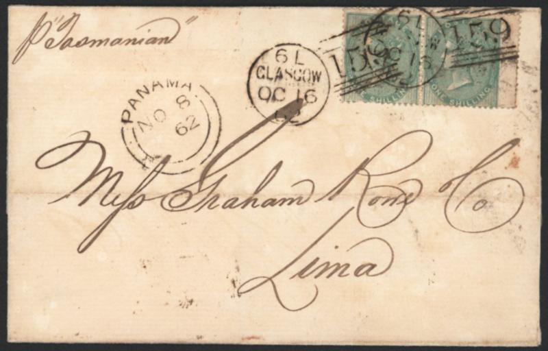 PERU 1862 cover from Glasgow to Lima, franked 1s green horizontal wing margin pair (SG.72), tied Glasgow duplexes for OCT.16.62, alongside PANAMA/NO.8.62 circular d/stamp, endorsed 'P.Tasmanian' reverse bears Lima arrival d/stamp for Nov 17th.