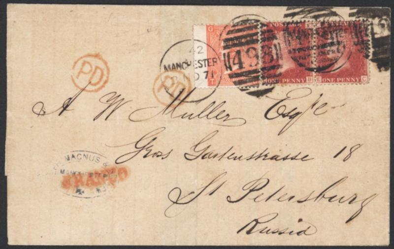 RUSSIA 1871 cover from Manchester to St. Petersburg, franked pair of 1864 1d reds + 4d vermilion Pl.12 (SG.94), tied Manchester duplexes for NOV.3.71, reverse bears receiver for 27.OCT.71.