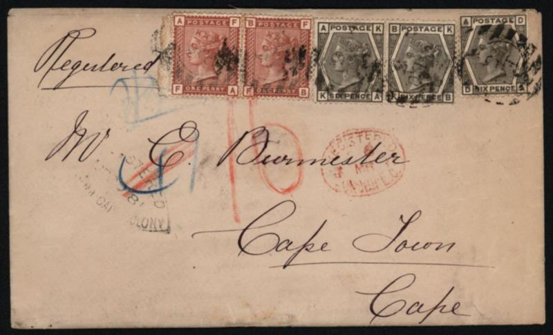 SOUTH AFRICA 1881 fine 'Registered' cover sent from London to Cape Town bearing a horizontal pair of 1d Venetian red (SG.166) and 6d grey Pl.17 (SG.147) x3 examples, all tied by London E.C/3 barred ovals, endorsed in m/s 'Registered' with red London reg oval d/stamp for MR.3.1881, a reg Cape Colony