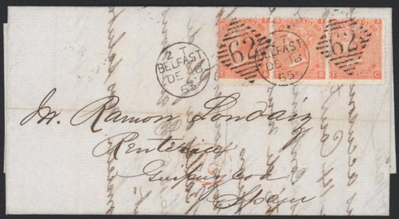 SPAIN 1865 entire letter from Belfast to Renteria, Gipuzoa, Spain, franked 4d vermilion Pl.7 strip of three TA/TC (SG.93), tied by superb Belfast duplexes for DEC.18.65, reverse bears very fine London c.d.s for Dec 19th in blue. Attractive cover. Stamps Cat. £290 off cover.
