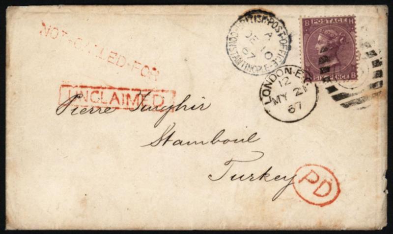 TURKEY 1867 envelope from London addressed to Stambool, franked 6d lilac Pl.6 (SG.97) lett HB, tied by London E.C duplex district '95' for MY.21.1867 and alongside a blue British Post Office Constantinople arrival c.d.s. alongside for DE.10.1867 with a good strike of the 'NOT-CALLED-FOR' and a crisp