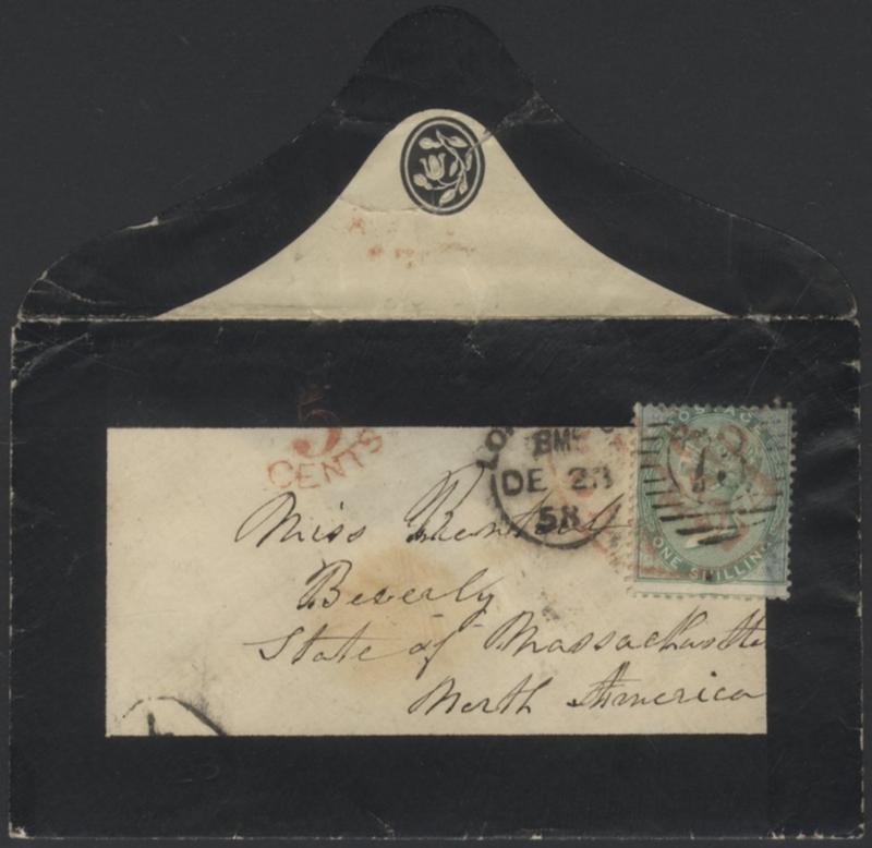 USA 1858 small mourning envelope from London to Beverly, Massachusetts, franked by 1s green (SG.72), tied by a London duplex for DEC.23.58, also tied by red U.S receiving cancel, 5/cents charge mark in red. Attractive little cover. Cat. £450.
