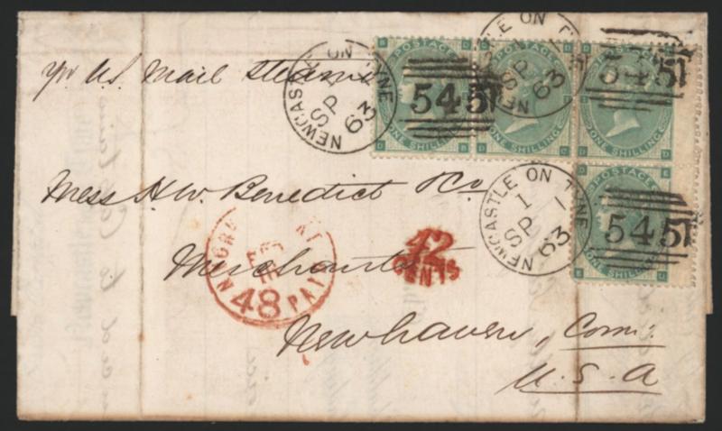 USA 1863 Aug 27th invoice from Rennoldson & Farley for coals shipped at Silloth on the Maria Adelaide for New York then to Newhaven, Connecticut, franked 1s green Pl.1 (SG.90) irregular block of four lett DB/DD + ED, tied by fine Newcastle-On-Tyne duplexes for SEP.1.1863, alongside h/stamp 42/CENTS