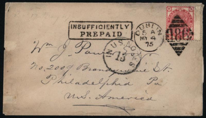 USA 1875 cover to Philadelphia, franked 3d rose Pl.16 KH (SG.144) from Dublin, tied by a superb Dublin duplex for MY.4.75 and alongside a boxed 'INSUFFICIENTLY/PRE PAID' h/stamp as well as U.S postage due mark. Most attractive overseas usage.