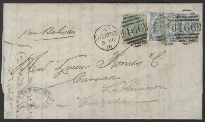 VENEZUELA 1878 entire letter from Liverpool to Caracas, franked 1s green Pl.13 (SG.150) & 2s dull blue (pair) lett QI/QJ (SG.118), tied by Liverpool duplexes for NOV.5.78, 2s blue lett QI affected by filing crease, obverse bears 'WIDOW DURANTY & SON' oval company h/stamp. Scarce franking. Cat. £955.