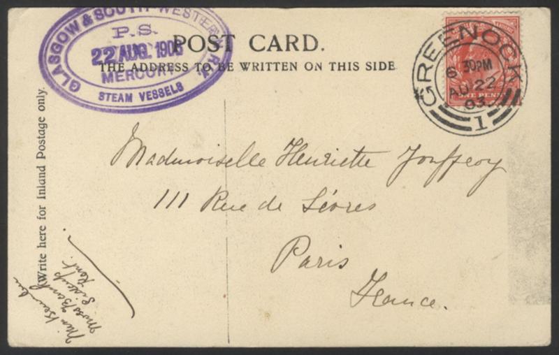 1903 Inveraray Castle PPC addressed to Paris, franked 1d Edward, tied Greenock double ring c.d.s. Obverse bears large oval cachet 'GLASGOW & SOUTH WESTERN RLY/P.S/22.AUG 1903/MERCURY/STEAM VESSELS' in purple. Very few items of mail are recorded from this steamer.