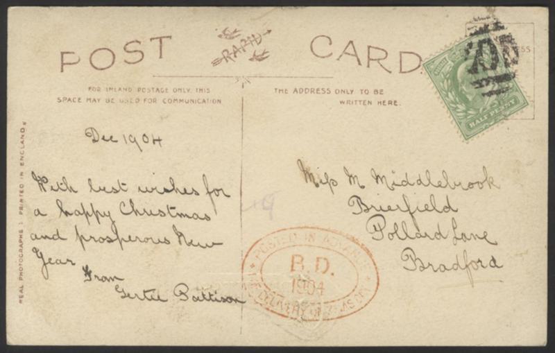1904 Greetings postcard sent to Bradford, franked ½d Edward, tied barred oval numeral, obverse bears red oval Bradford cachet 'POSTED IN ADVANCE FOR DELIVERY ON XMAS DAY/B.D 1904.' Scarce.