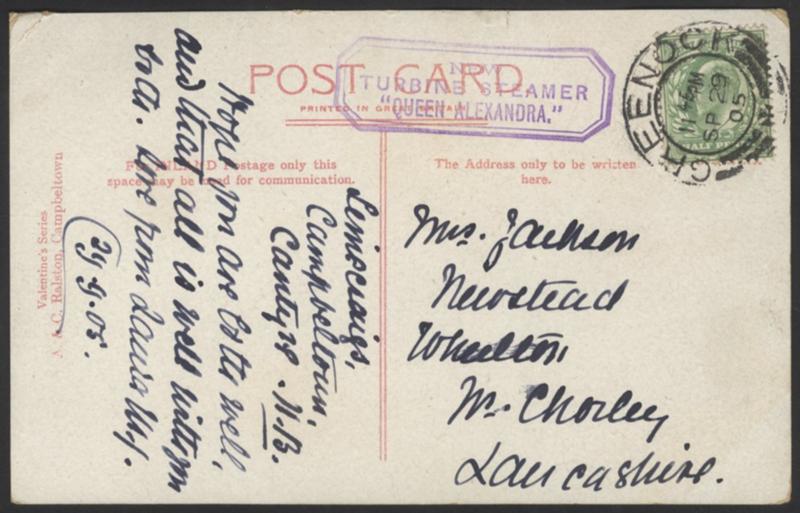 1905 PPC of Campbeltown to Chorley, Lancashire, franked ½d Edward, tied Greenock c.d.s for SP.29.05 and alongside 'NEW/TURBINE STEAMER, QUEEN ALEXANDRIA' purple cachet. Very scarce.