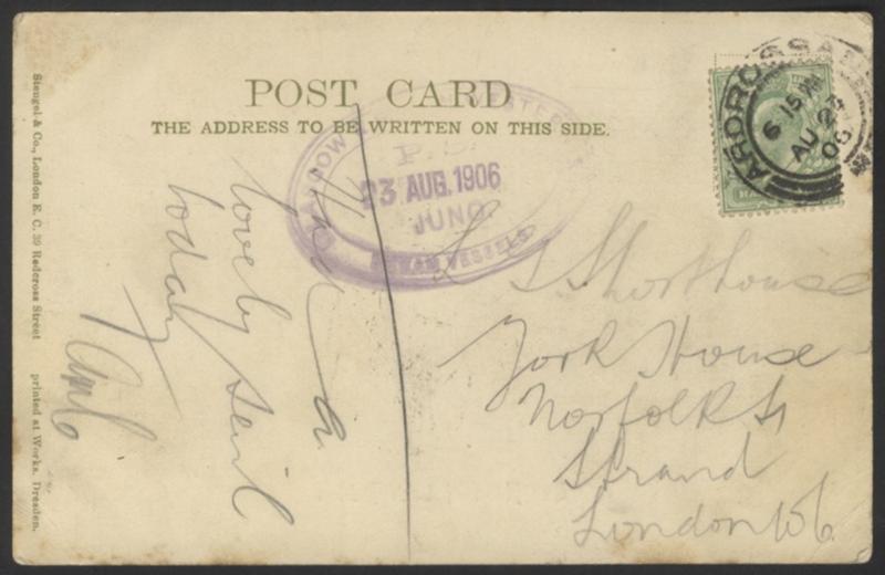 1906 Loch Riddon PPC sent to London, franked ½d Edward tied 'Ardrossan' c.d.s for AU.23.06 & alongside large oval cachet in purple 'GLASGOW & SOUTH WESTERN RLY/P.S/23 AUG 1906/JUNO/STEAM VESSELS.' Scarce.
