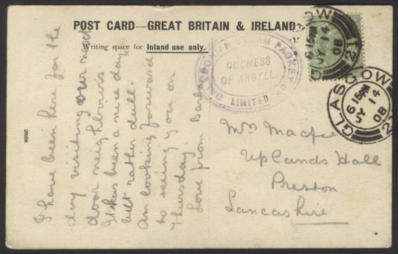 1908 PPC of Whiting Bay, I.O Arran, sent to Preston, franked ½d Edward, tied Glasgow double ring c.d.s. for JY.14.08 and alongside oval cachet 'CALEDONIAN STEAM PACKET CO LTD/ DUCHESS/OF ARGYLL' in purple. Very scarce.