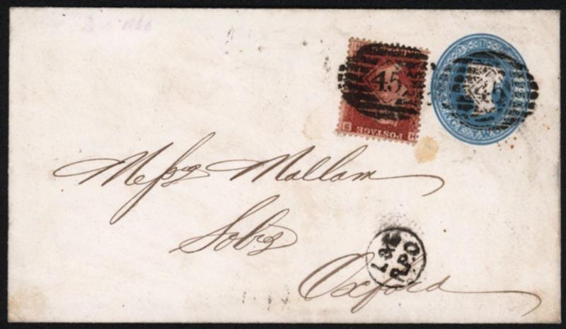 1866 2d blue Embossed envelope, VFU example uprated with a 1d rose red (SG.43) Pl.74, both cancelled by a double London City '45' numeral bearing a crisp black 'L&E/R.P.O' (London & Exeter Railway Post Office) h/stamp below, b/stamped by a London despatch c.d.s. for DE.3.1866 and an Oxford arrival c