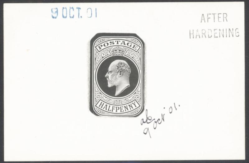 1901 ½d Newspaper wrapper stamp Die Proof on glazed card (92 x 60mm) h/stamped '9.OCT.91' in blue and 'AFTER HARDENING' in black, fine. (1)