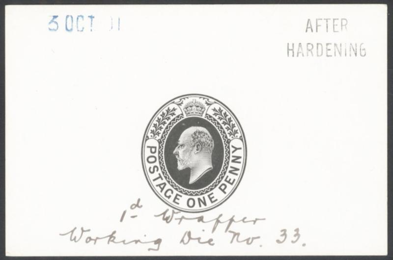 1901 1d stationery wrapper Die Proof on glazed card (92 x 60mm) h/stamped '3 OCT 01' in blue with manuscript '1d wrapper working die no.33' h/stamped 'AFTER HARDENING' in black, fine.