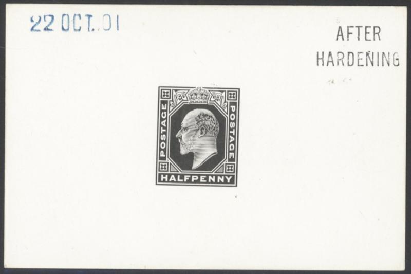 1902 ½d stationery postcard Die Proof on glazed card (92 x 60mm) h/stamped '22 OCT 01' in blue and 'AFTER HARDENING' in black, fine.