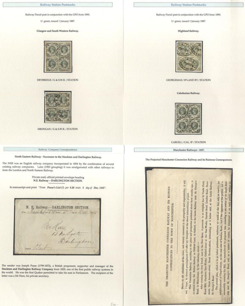 c1880-1910 written up collection on exhibition leaves incl. 1887 1s Jubilee blocks with Railway oval d/stamps, covers & cards with station cancels, perfs, items of ephemera etc. Viewing recommended. (50 items)