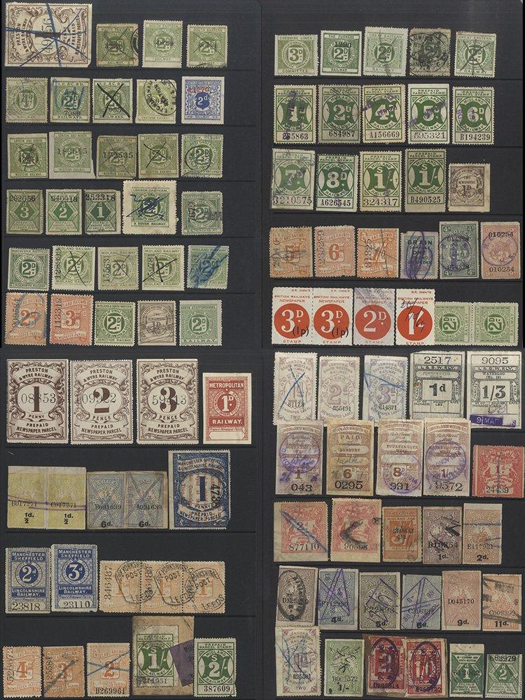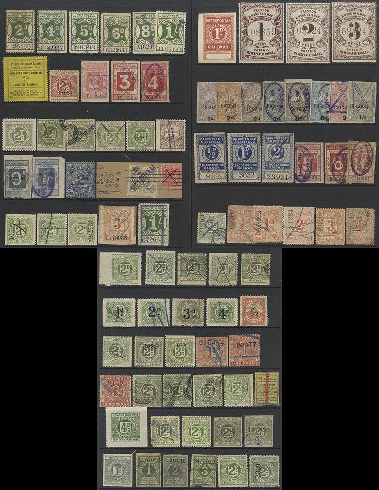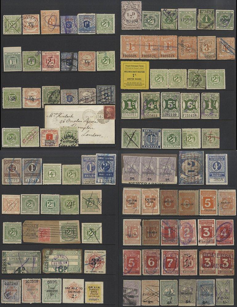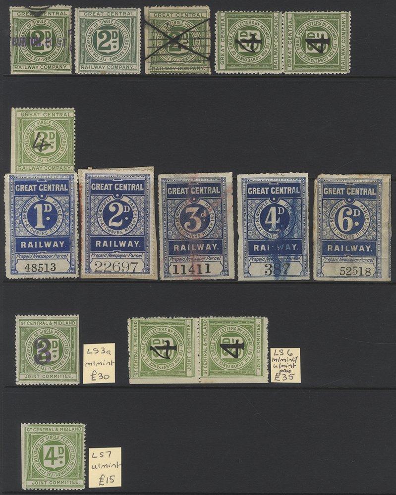 GREAT CENTRAL RAILWAY 1897 2d U with Burton Point cancel LS1, 1903 3d unused LS7, 1905 2d U LS10, 1920 3d m/s 4 LS18, vertical pair with two different figure 4's LS18b, 1922 4d unused LS19, range of Railway Parcel Stamps in blue 1d, 2d, 3d, 4d & 6d. GREAT CENTRAL & MIDLAND 1920 3d Surch '3' in black