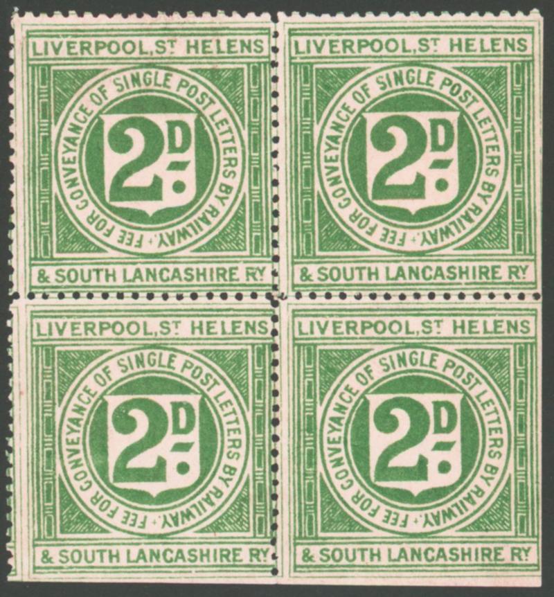 LIVERPOOL ST. HELENS & SOUTH LANCASHIRE RAILWAY 1899 (Oct) 2d deep green M block of four (only 240 issued), Cat. £400++