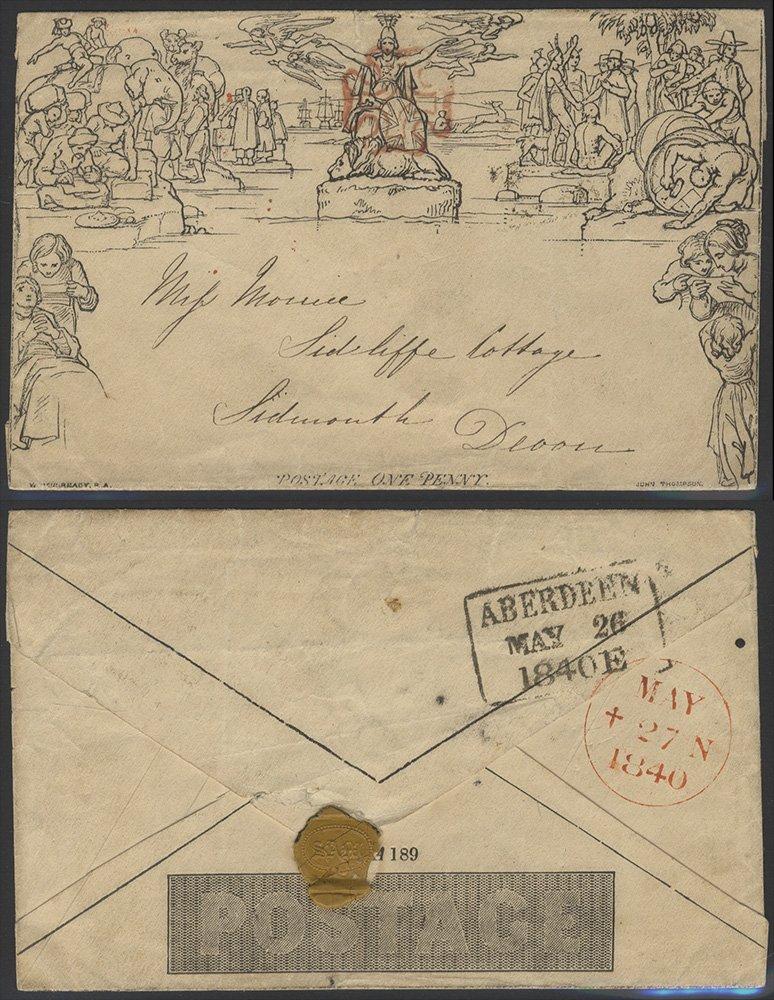 One Penny Envelope 'A189' from Aberdeen to Sidmouth, Devon, cancelled by fine red MC, reverse bears Aberdeen despatch mark for May 26th, Edinburgh transit for 27th. Good May date example. Cat. £1200