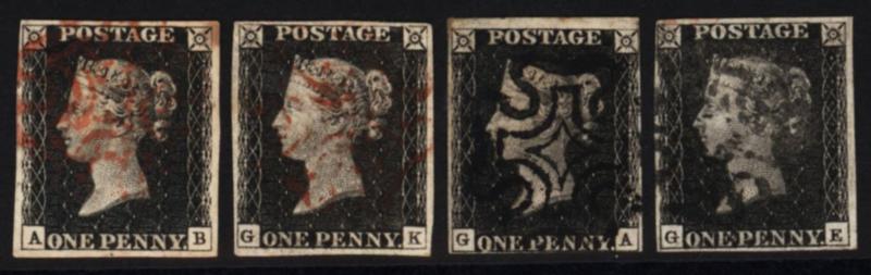 UNPLATED AB & GK both four margined, cancelled in red, also GA four margined, very close cut at base + GE four margins, cancelled in black. (4)