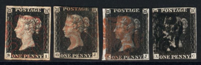 UNPLATED BI - four margins (creased), fine red Maltese Cross, GJ & KJ - both four margins cancelled in red, AC - three margins cancelled in black. (4)