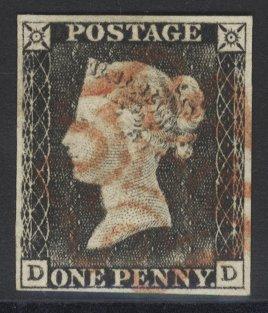 Plate 1a DD, grey black (worn plate), four good margins, fine red MC. (1)