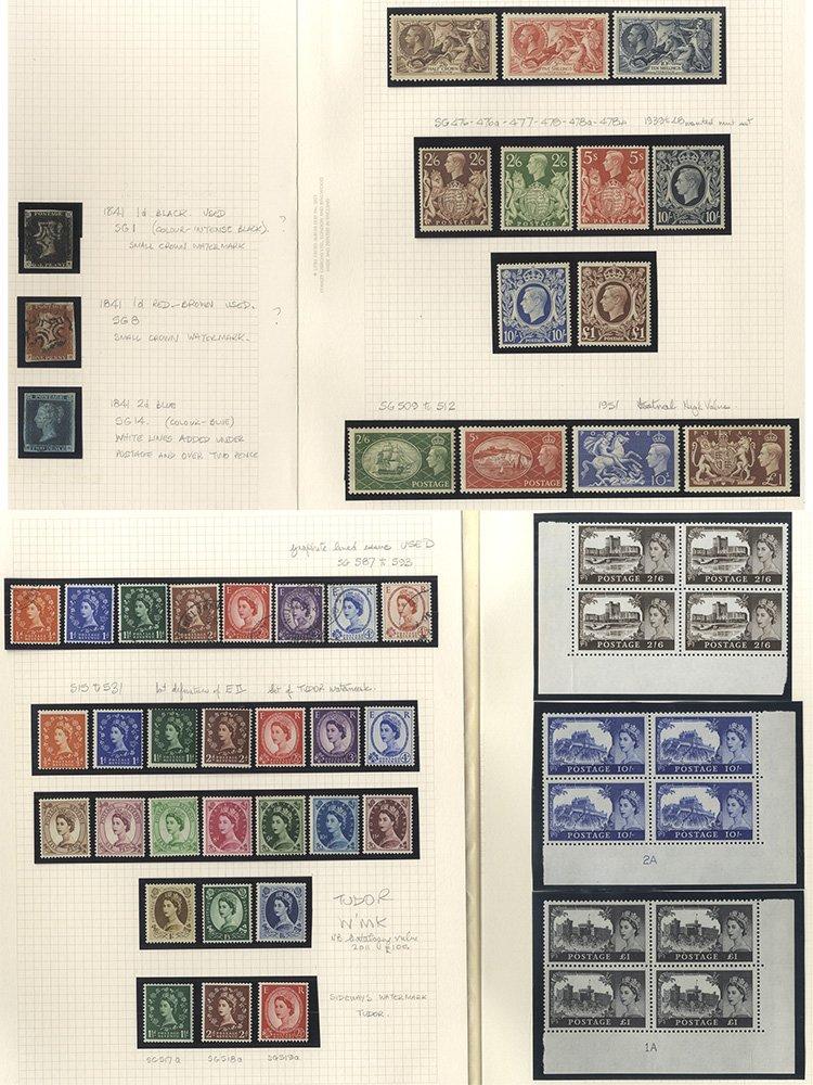 COLLECTION in a Utile album incl. 1840 1d black, close to good margins, 1841 2d, a few 1d Plates, 1934 Re-engraved set M, 1939 & 1951 Festival High vals M, several defin sets incl. 1937, 1952, 1955 UM, also 1958 Graphites VFU, Bradbury Castle Plate blocks & some LSD Machin blocks etc.