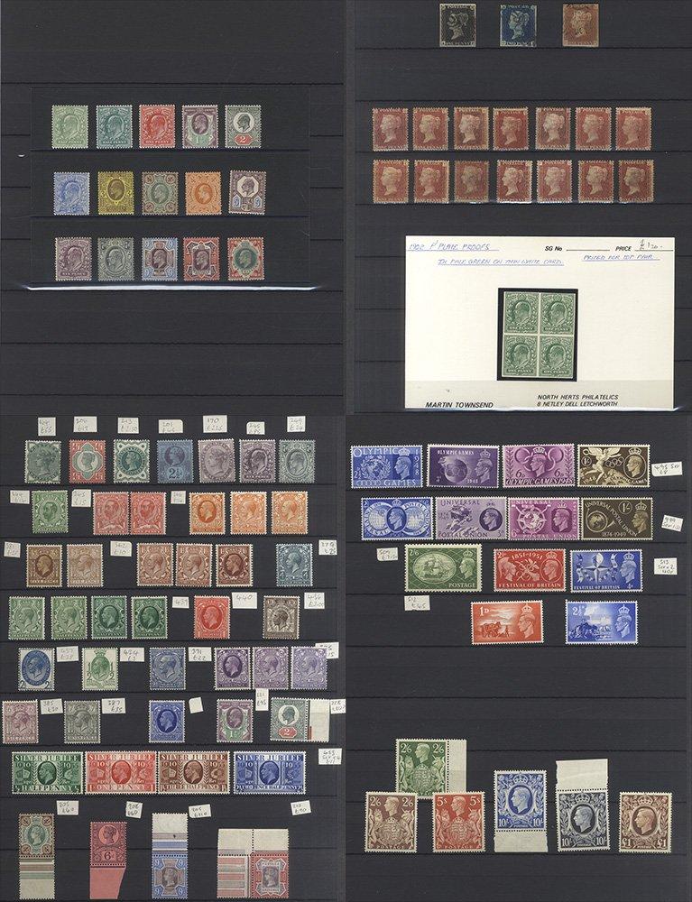 1840-1969 selection on black stock leaves, highlights incl. 1840 1d black, four margins, 1840 2d, three margins, a few 1d red Plate numbers, M (mixed condition), 1887 Jubilee 4d, 6d, 9d & 10d marginals UM, KEVII ½d to 1s M (basic set) mixed condition, 1d Plate Proof in green - block of four, 1937 De