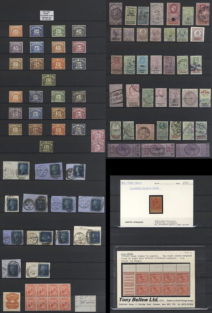 ACCUMULATION in a stock book with a useful range of UM Postage Dues incl. 1924 4d & 1s, 1936 set to 1s, 1937, 1951, 1954 & 1955 sets (some U incl. 1924, 1936 & 1954 sets). Also a few U Officials, Foreign Bill, Contract Notes etc, a few 1d & 2d blue Plates on piece, KEVII 1d scarlet on buff Plate Pro